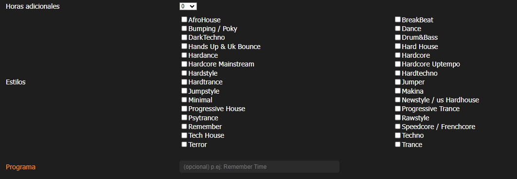 Seguimos cumplimentado el formulario para reservar tu horario indicando si se desea más de un espacio para emitir, tus estilos musicales, un nombre para tu programa; y clickamos en COGER HORA (parte inferior).