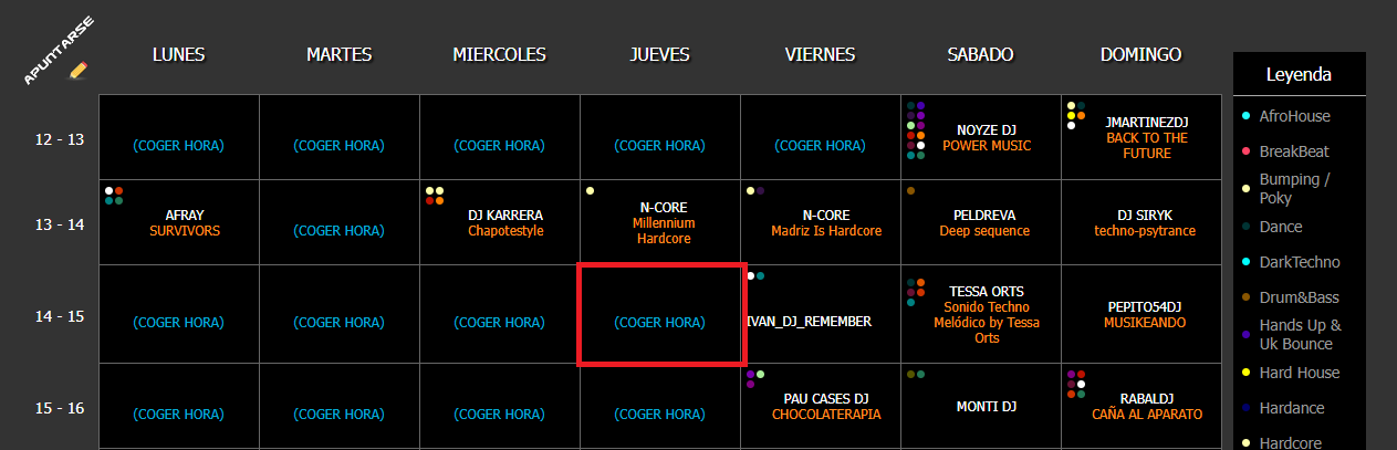 Una vez en la ventana HORARIO, tendrás que buscar un hueco en la parrilla horaria y seleccionar (COGER HORA).